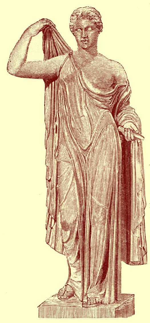 The younger goddess, on the other hand, is described ( Hesiod, Theogony, 188-206) as the offspring of Uranus, born amidst the foam of the sea, first stepping on land in Cyprus, and styled Anadyomenē, or “she who came out of the sea.” Under the title of Urania she was regarded as a personification of that power of love which was thought to unite heaven, earth, and sea into one harmonious system, 107 and as such was distinguished from Aphrodite Pandemos, the personification of love among men. As the goddess born of the foam of the sea, she naturally came to be held in veneration by the fishermen and sailors on the coast as the goddess of the smiling sea, and the cause of prosperous voyages. hence it was the custom in the island of Ægina to follow up the sacrifice and banquet in honor of Poseidon [Neptune] with a festival of great rejoicing and excitement in honor of Aphrodite. In Cnidus she was styled and worshipped as goddess of the peaceful sea; a character which is symbolized by the dolphin grequently given her as an attribute. The island of Cythera (Cerigo) derived its name from one of her titles, Cytherea, the belief being that she ahd appeared there before landing on Cyprus.