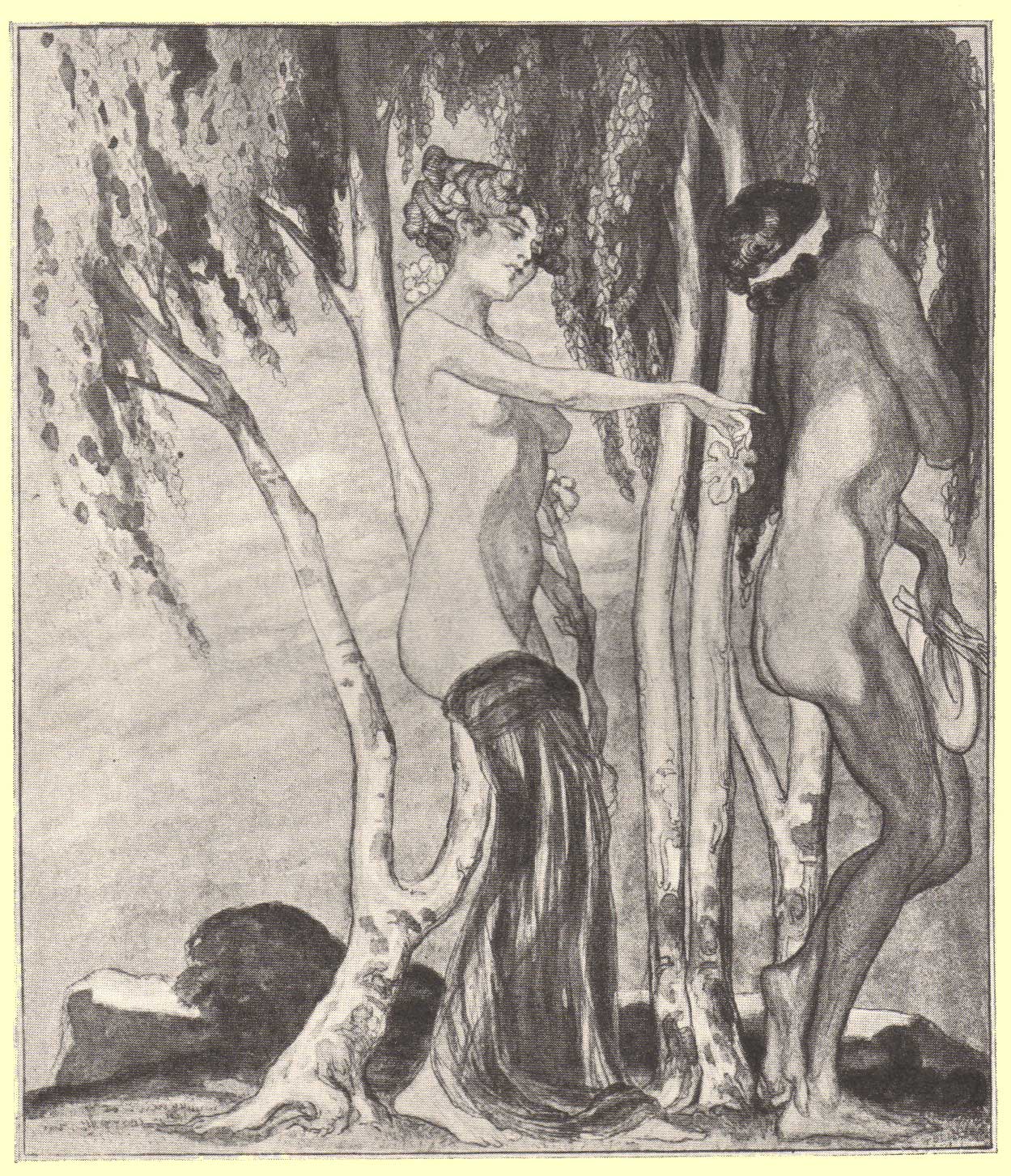 NANNA: It stood on a little mountain of rising ground, and it bore the name of Calvary. In the center stood a cross with three big wooden spikes, which greatly frightened the common wenches, and this cross had on its neck a crown of thorns and on each arm two hanging lashes made of knotted cord, and at the bottom was a death’s head, and on one side, fastened into the earth, was a sponge above a reed, and on the other sides a piece of iron in the form of a rusty javelin, on the top of which was an old partisan’s pike. Where the mountain sloped downward was a little garden, around which rosebushes made a low wall, with a postern gate made of the interwoven withes of briny shrubs; this gate had a wooden key of its own, and in the whole plot one would not have been able to find a single stone, so clean did the Hermit keep the place. The squares of the garden were separated by pretty little paths, and they were full of various herbs, on this side crisp lettuces and saltworts, on the other side fresh greens and tender, and some young garlic such as the whole compass could not raise or bear, some of the finest cabbages in the world, cap-mint, mint, anet, sweet marjoram; and the parsley, too, had its place in the little garden, in the middle of which an almond tree, one of those large ones without beards, cast its shade. Through a few little 81 rivulets flowed clear water, which, issuing from a vein among the sprightly stones at the foot of the mountain, gushed forth among the greenery; and all the time that the Hermit stole for his devotions, they spent in nourishing the little garden. Not far away stood the chapel with its steeple and two small bells, and leaning against the wall of the chapel stood the hut where the Hermit took his repose. Into this little paradise came the doctor’s wife, as I have told you, and to keep the body from being envious of the soul, this pair one fine day, having retired into the hut on account of the sun, which gave them great discomfort, proceeded, I do not know how, to work their evil ends; and as they did so, a villager (their biting tongues are the worst of all), in looking for his ass’ he-colt which had wandered from its mother, and passing (quite by accident) the hut, saw the holy couple joined together; running back to the town, he signaled the people with a few strokes on the bell, and the populace hearing him, the most of them abandoned their tasks and gathered at the church, no fewer women among them than men; and there they found the villager, who told the priest how the Hermit was working miracles. Whereupon the priest, putting on his holy frock, with the stole about his neck and the book in his hand, and with no less than fifty persons following him, arrived in the midst of a credo at the hut, where they found these two heavenly slaves, the man-servant and the maid-servant, sleeping like ditch diggers. The Hermit, snoring, held his whip to the back of the devoted lady who loved the rope; whereupon the crowd, at first view, remained silent, as a good woman does when she sees a horse and a mare, and then they broke into a laugh at seeing their ladies come to such as this, and the laugh woke the two dormice. They roused from their sleep. As they did so, the priest, seeing them joined together, cried out in a thunderous voice: Et 82 incarnatus est.